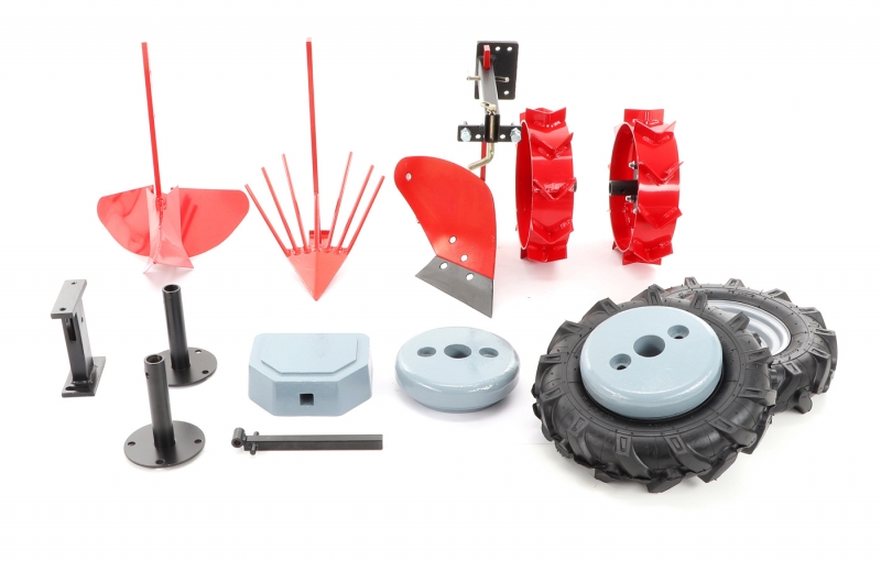 Kompletní velký KIT (šípová kola 400x8 včetně nábojů, kovová kola včetně nábojů, KIT závaží - kolové i přední protizávaží, jednostranný pluh, vyorávač brambor, hrobkovač, závaží a adaptéry)