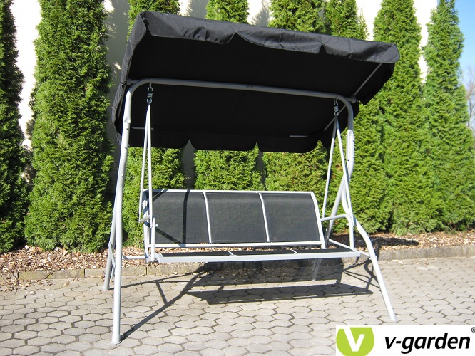 Velikost: 170x110x152cm. Průměr trubek: 35 mm. Hmotnost: 25 kg. Zahradní třímístná houpačka zavěšená na vinutých pružinách, vyrobená z ocelových trubek a povrchově dokončena komaxitovou barvou. Vhodná pro zahradní kryté plochy. Nevhodná pro použití ve vlhkém prostředí. Čalounění textiline. Nosnost 200 kg.